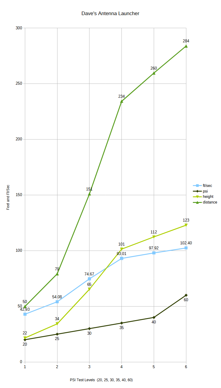 That suggested the need to run several more test launches to associate that which he knew with the things he didn’t know. The graph below are the results of eighteen such tests at increasing pressure values. Counting the number of seconds from a vertical blast off to the thud of an earth impact, and applying a little high school math, David derived the following graph for a 60 degree launch angle.