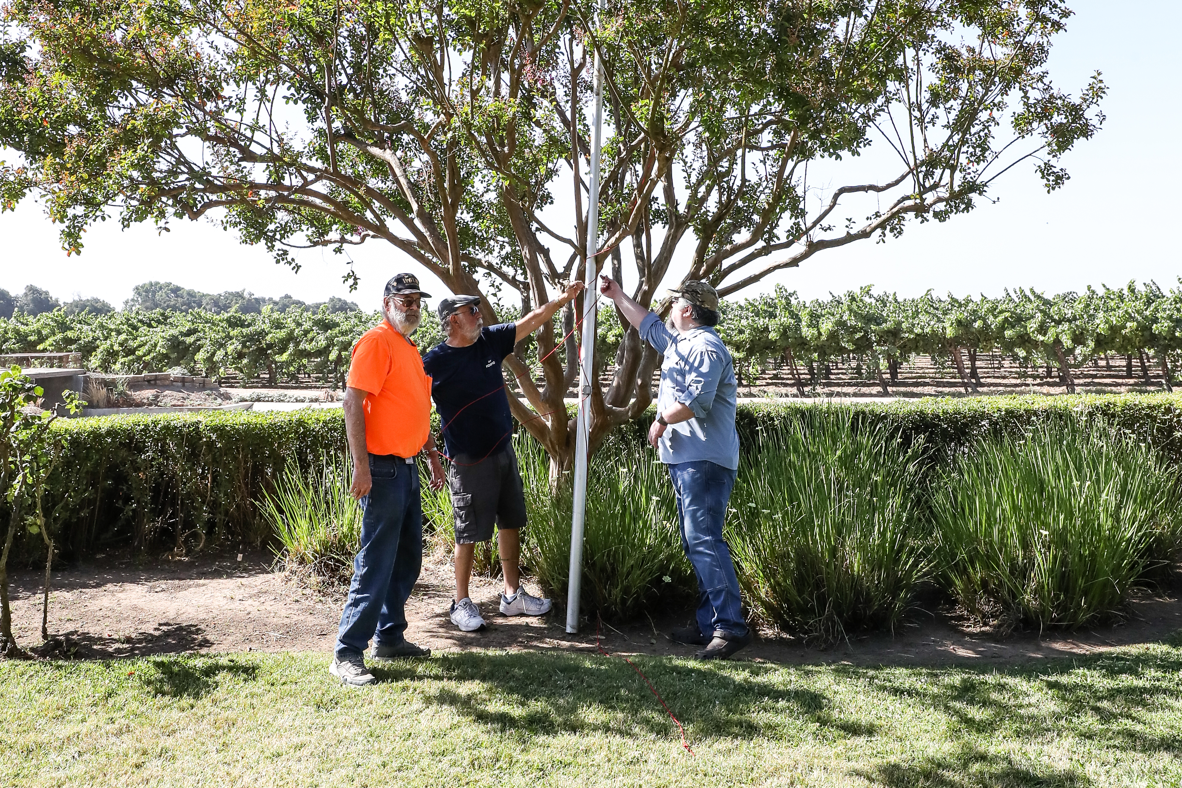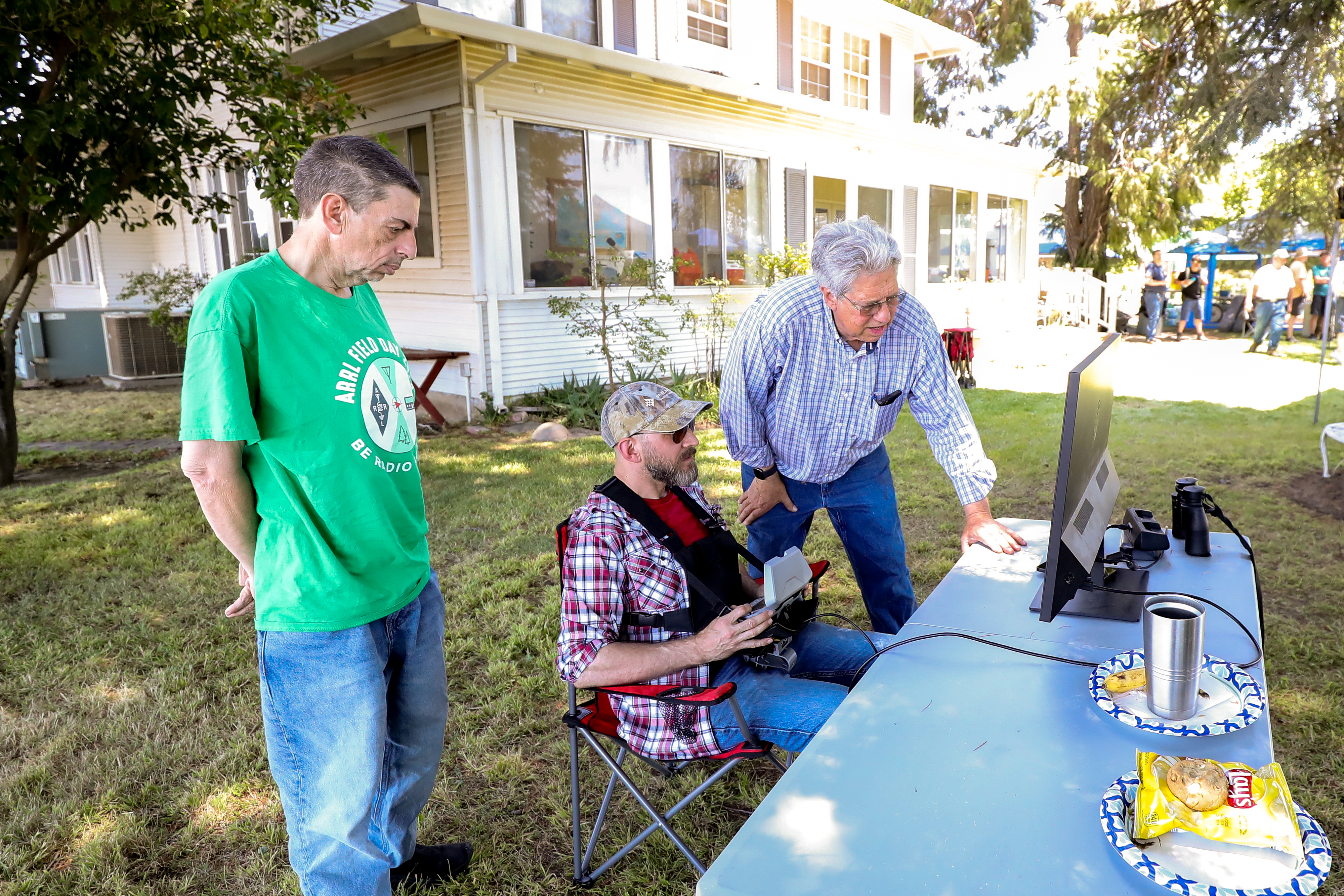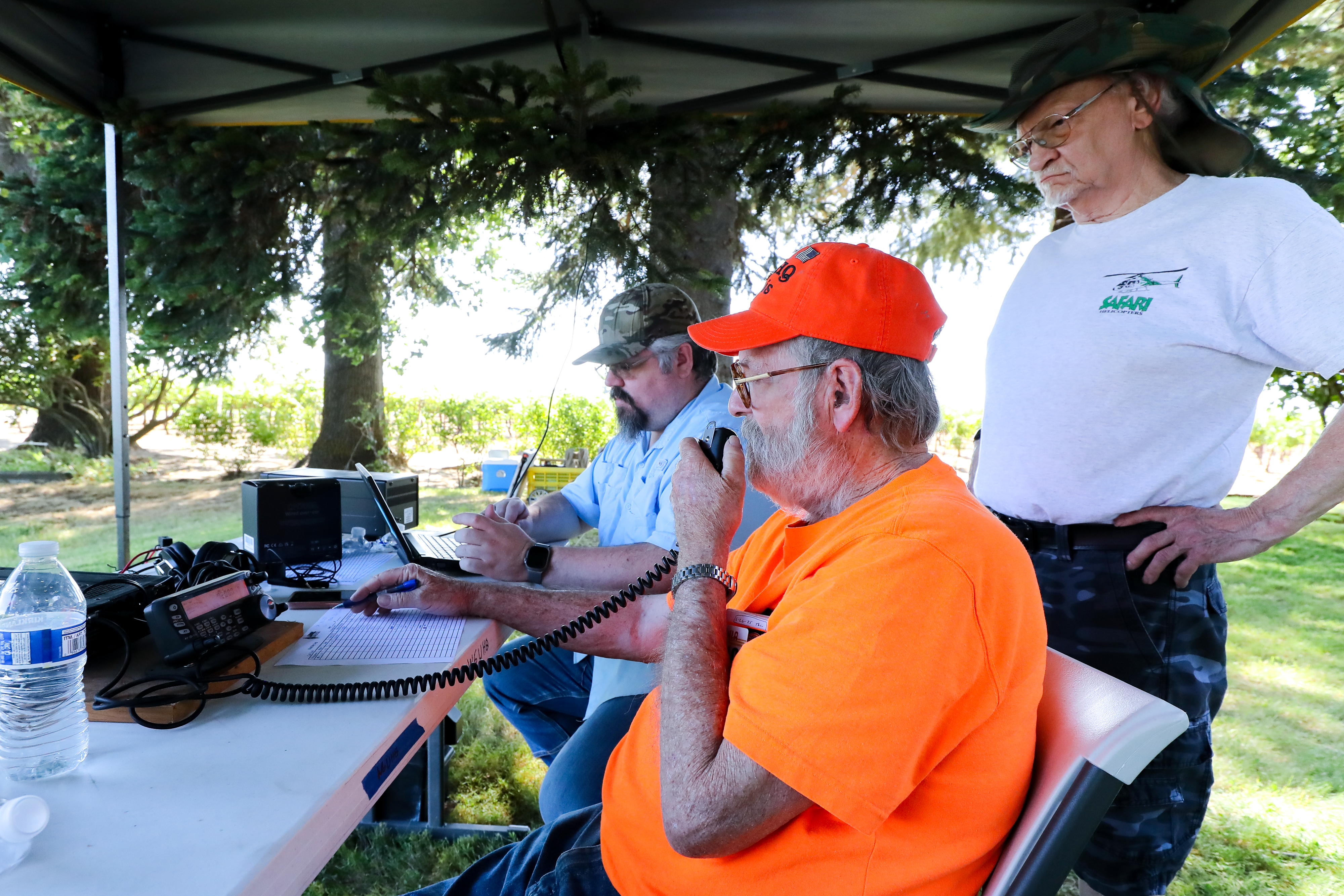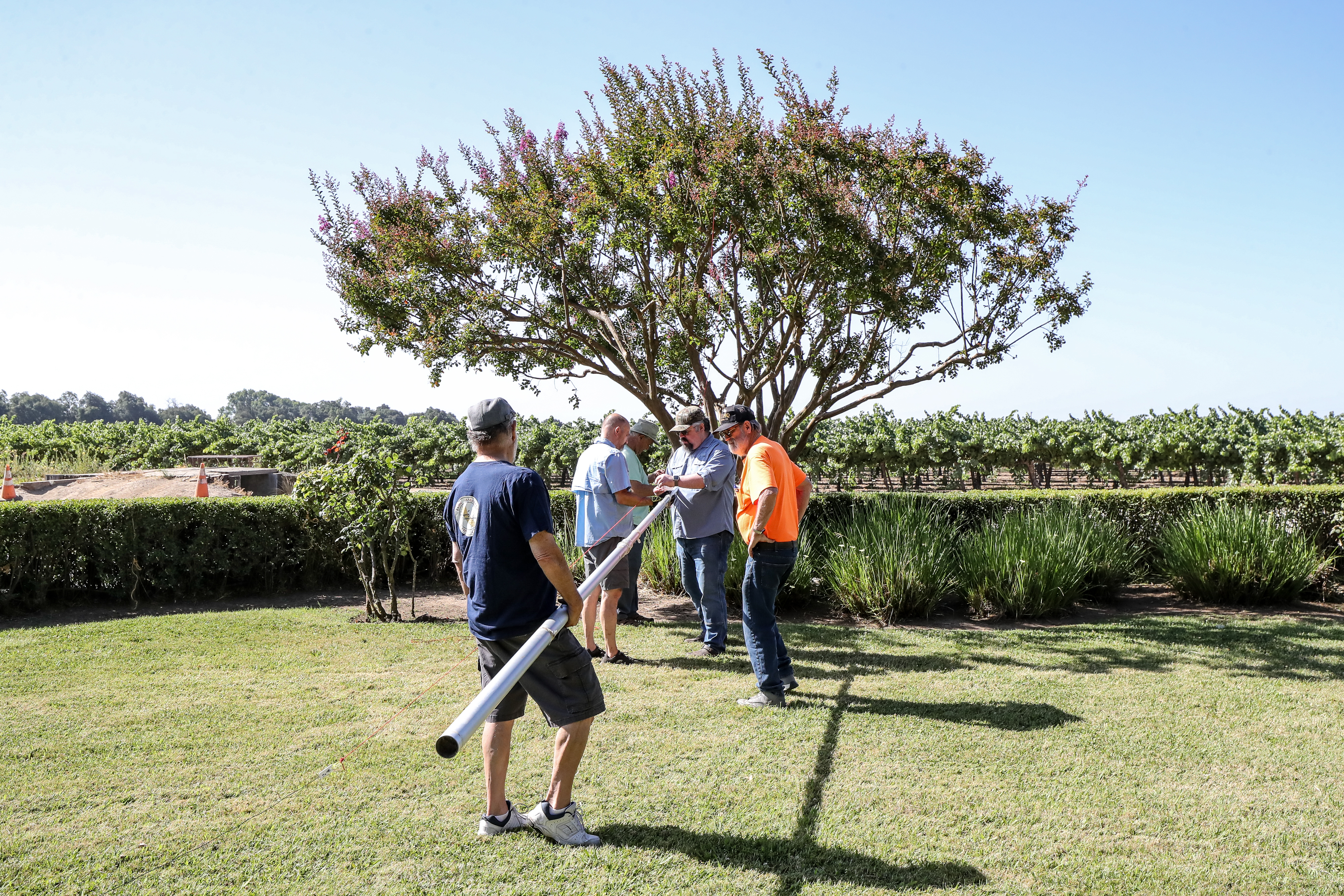 One aspect of Field Day is the opportunity for young and old to work together and learn from each other. As seen below, it may have taken three grown men to pull a nylon string through a tennis ball and a grape harvester as an antenna support, but we are good innovators and had lots of fun figuring things out. Why not attend one our monthly meetings and get to know us?