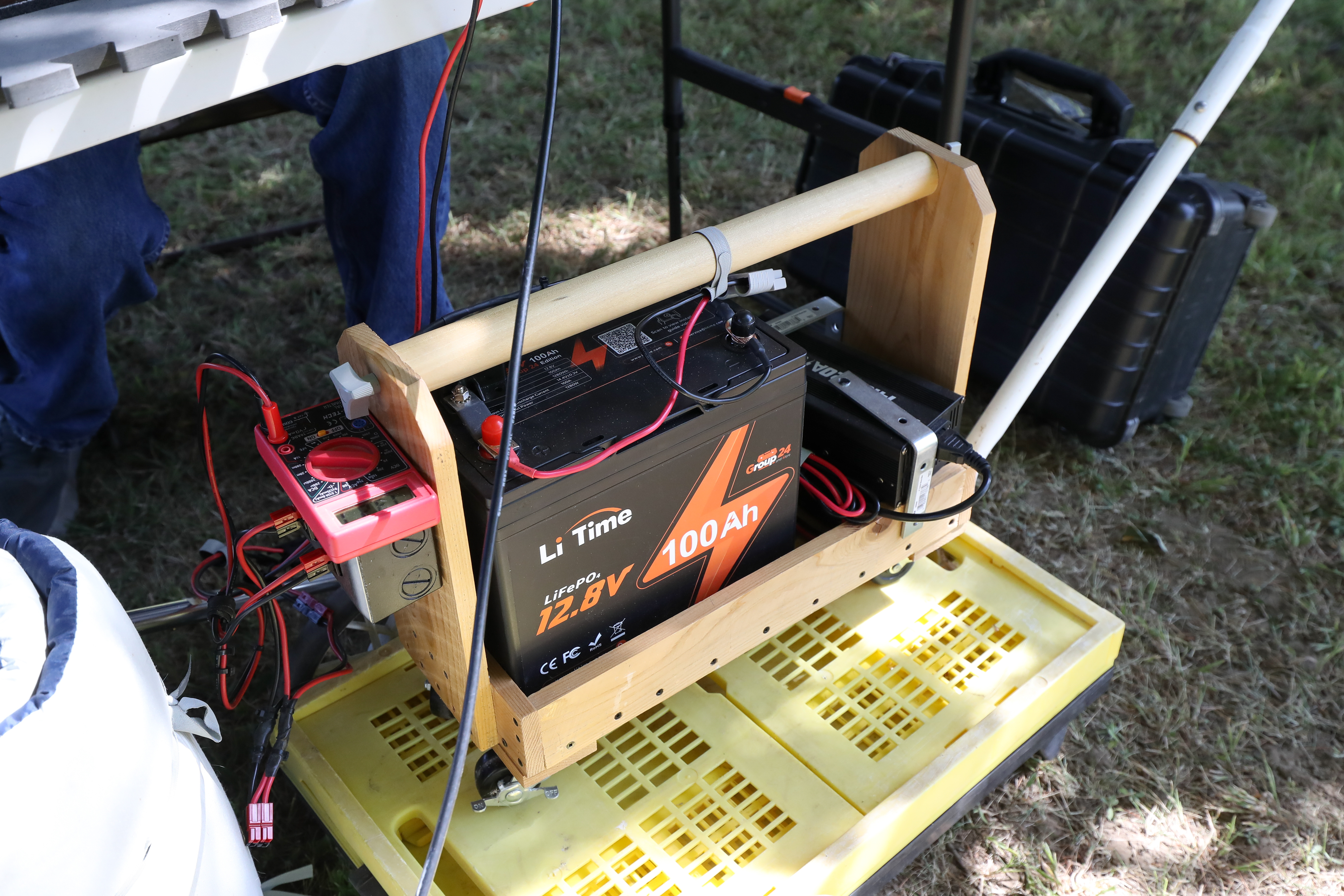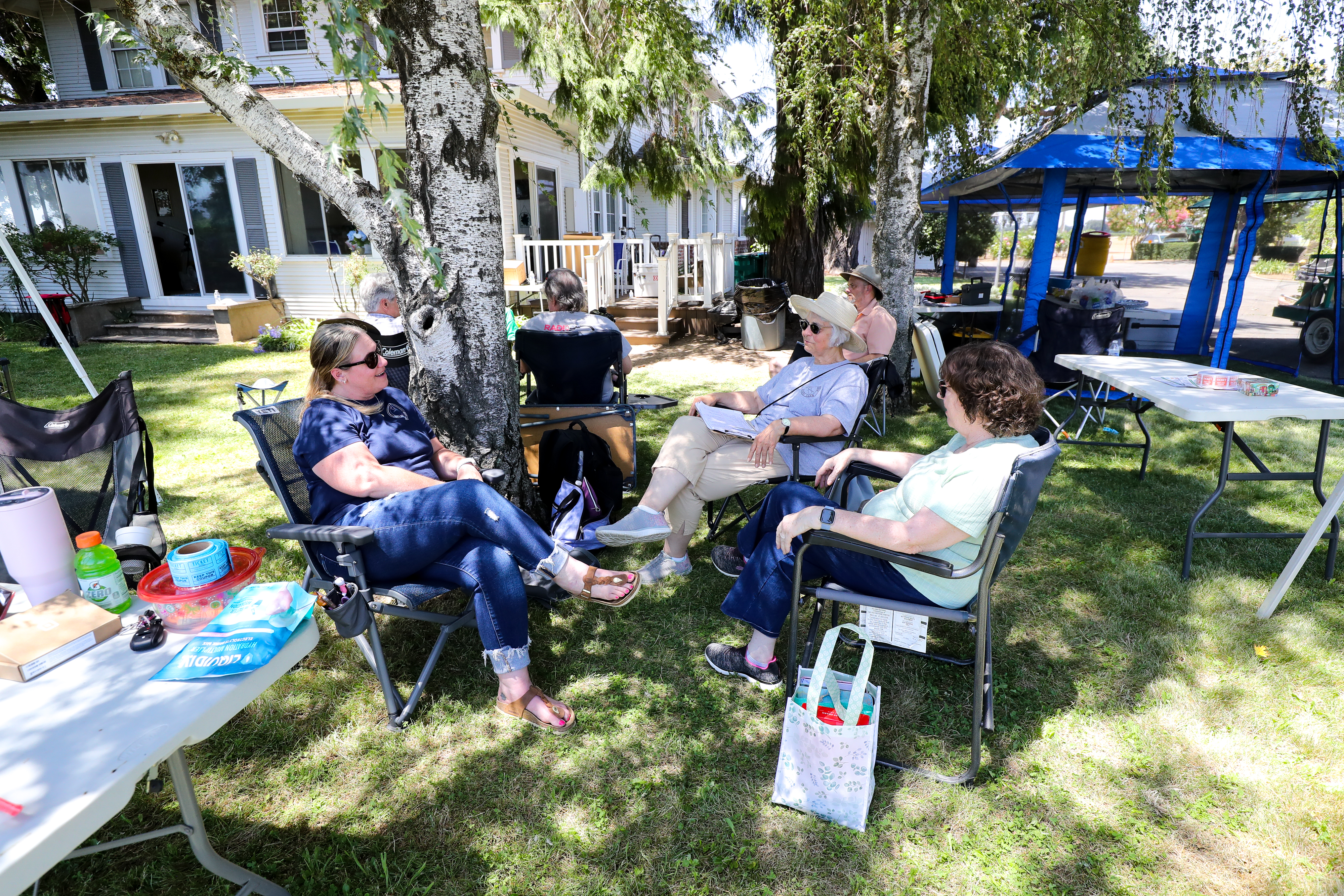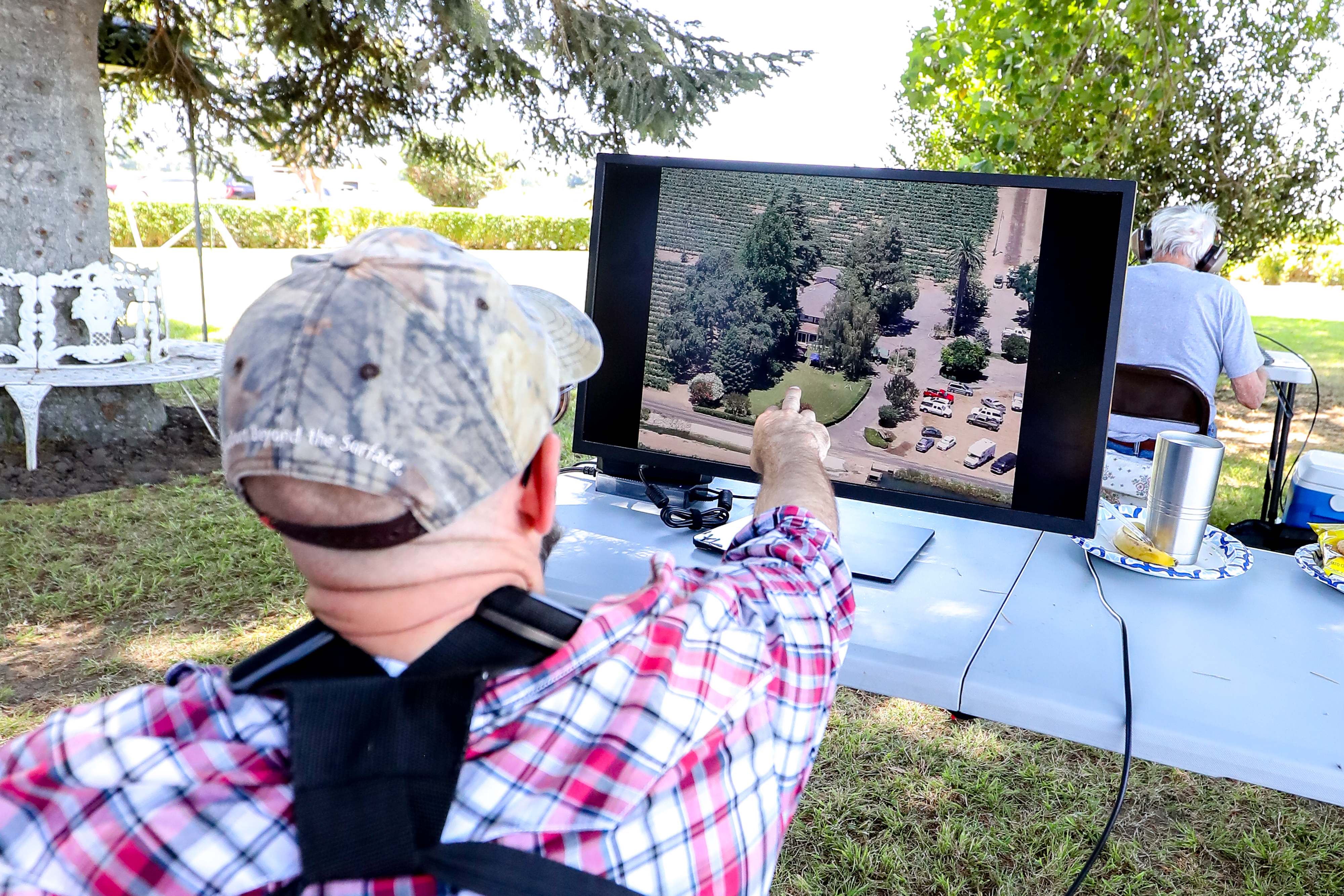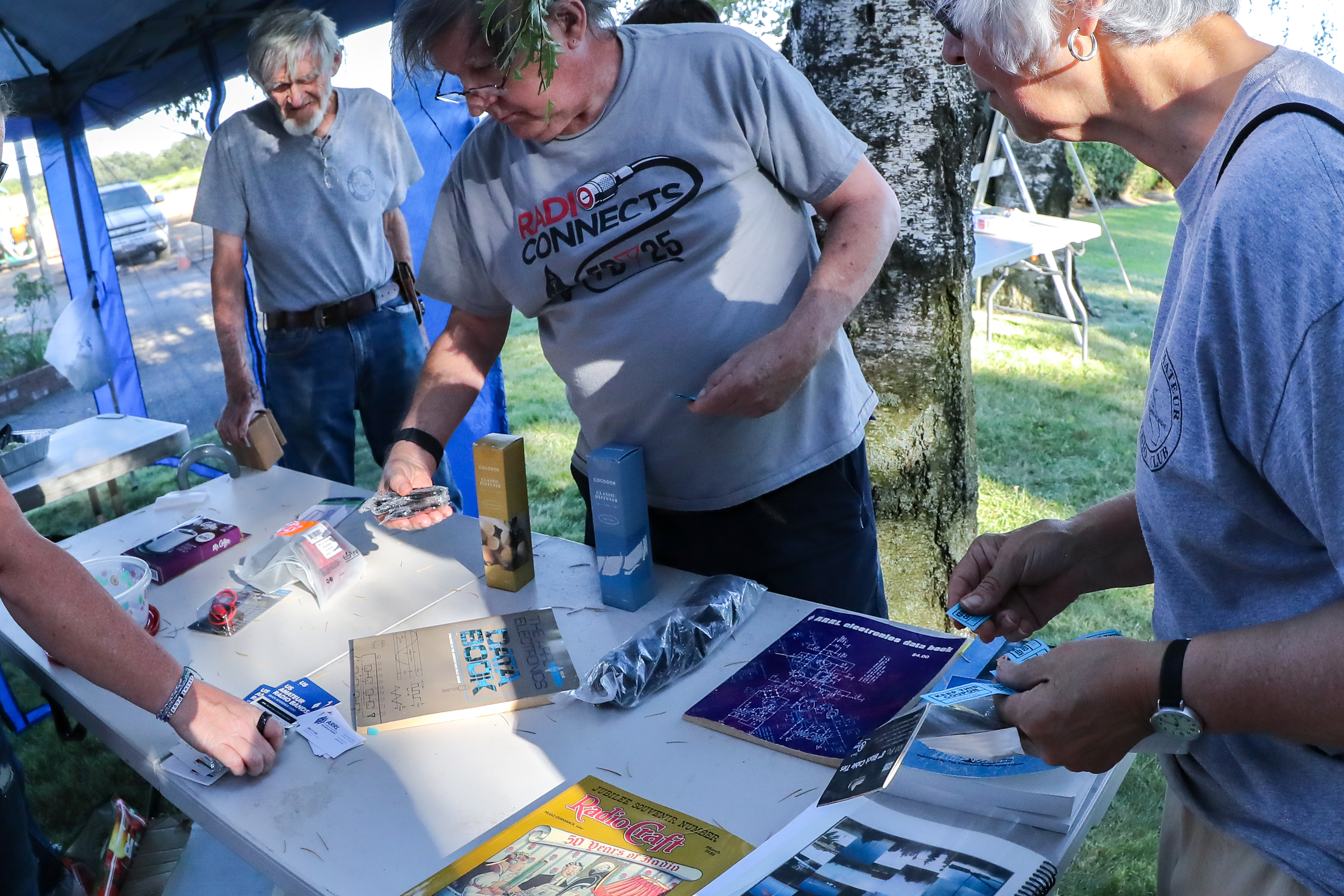 One aspect of Field Day is the opportunity for young and old to work together and learn from each other. As seen below, it may have taken three grown men to pull a nylon string through a tennis ball and a grape harvester as an antenna support, but we are good innovators and had lots of fun figuring things out. Why not attend one our monthly meetings and get to know us?